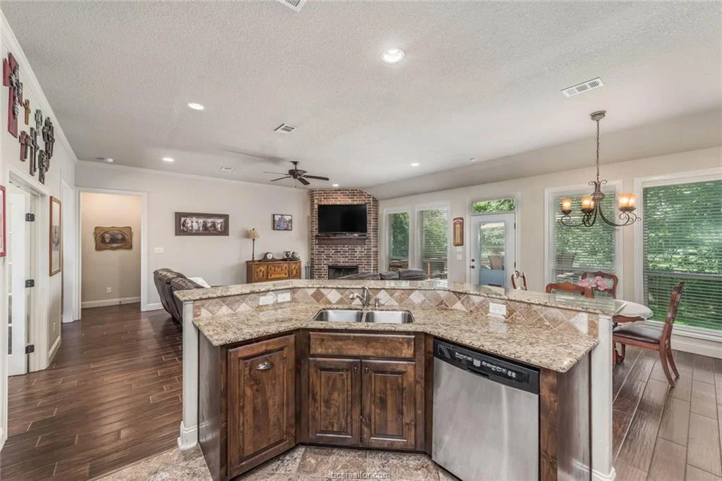 Must see, beautifully maintained home in the convenient South Hampton subdivision. Open floor plan with a split bedroom layout. Large lot with mature trees, large wooden deck excellent for entertaining, in your privacy fenced backyard. Living room features brick fireplace with hearth, ample crown molding, beautiful wood tile flooring and opens to the kitchen and dining. Flex room off the living area has french doors, could be used as a dining, study, or all purpose. Kitchen features stainless steel appliances, knotty alder cabinets, granite countertops and a walk-in pantry. Buit-in desk in the hall area. Low maintenance, no carpet, tile and wood tile throughout the entire home.